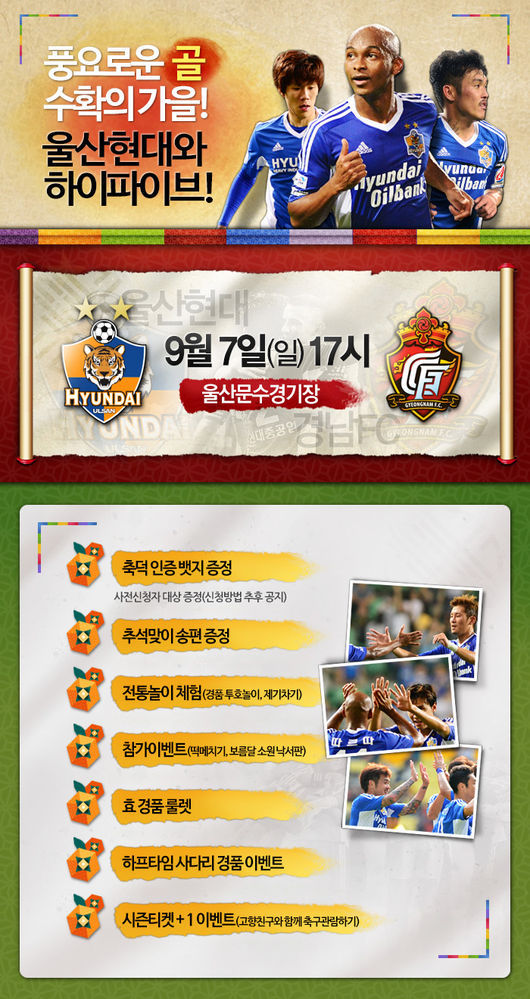 프로축구 울산현대가 오는 7일 오후 5시 문수축구경기장에서 열리는 현대오일뱅크 2014 K리그 클래식 24라운드 경남FC와의 홈경기를 명절특집으로 치른다.