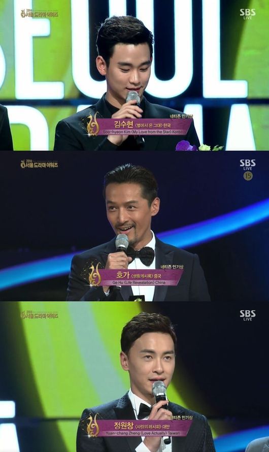 김수현, 호가, 정언창 세 사람은 4일 오후 서울국립극장 해오름극장에서 진행된 '2014 서울 인터내셔널 드라마 어워즈(Seoul International drama awarda)'(이하 2014 SDA)에서 네티즌인기상을 수상했다.