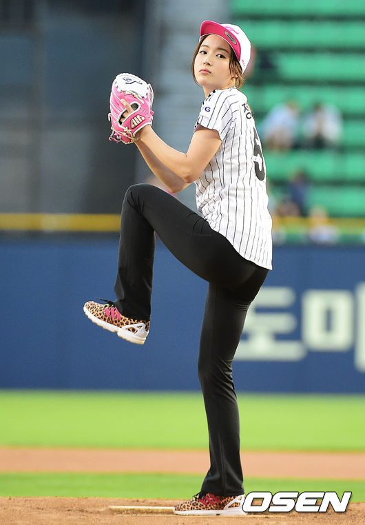 시구자로 나선 배우 정다혜가 투수 마운드에서 와인드업하고 있다.