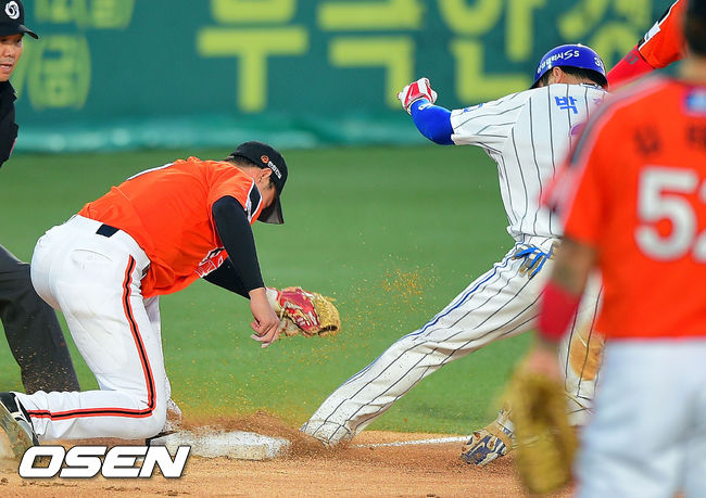 4일 오후 대구구장에서 열린 2014 한국야쿠르트 세븐 프로야구 삼성 라이온스와 한화 이글스의 경기, 1회말 무사 1루 삼성 박한이가 선취 1타점 2루타를 날린 후 3루에서 아웃되고 있다.