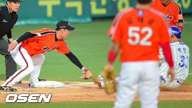 4일 오후 대구구장에서 열린 2014 한국야쿠르트 세븐 프로야구 삼성 라이온스와 한화 이글스의 경기, 1회말 무사 1루 삼성 박한이가 선취 1타점 2루타를 날린 후 3루에서 아웃되고 있다.
