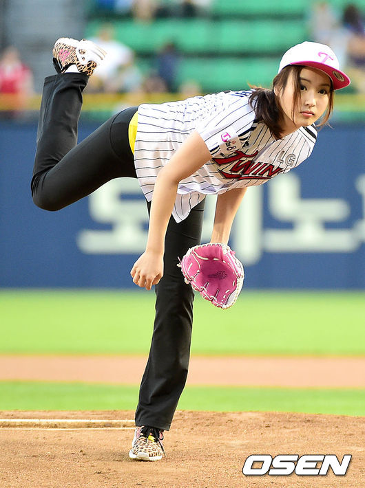 시구자로 나선 배우 정다혜가 힘차게 공을 던지고 있다.