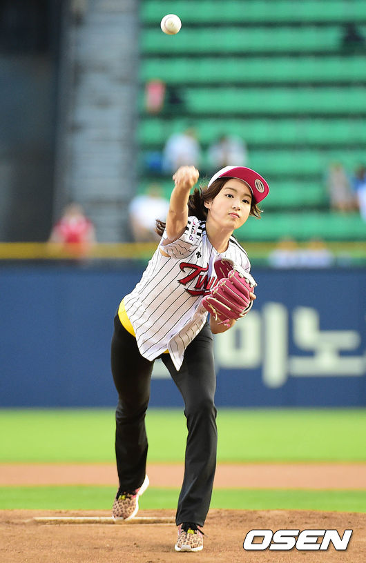 시구자로 나선 배우 정다혜가 힘차게 공을 던지고 있다.