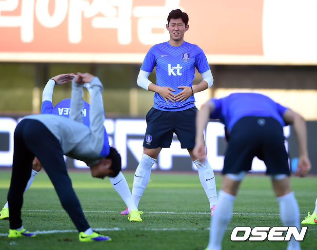 손흥민이 훈련에 앞서 스트레칭을 하고 있다.