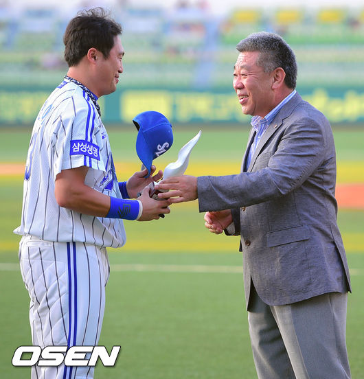 4일 오후 대구구장에서 열린 2014 한국야쿠르트 세븐 프로야구 삼성 라이온스와 한화 이글스의 경기에 앞서 삼성 박한이가 통산 1000 득점 KBO 시상에서 조종규 심판위원장에게 기념패를 전달받고 있다.