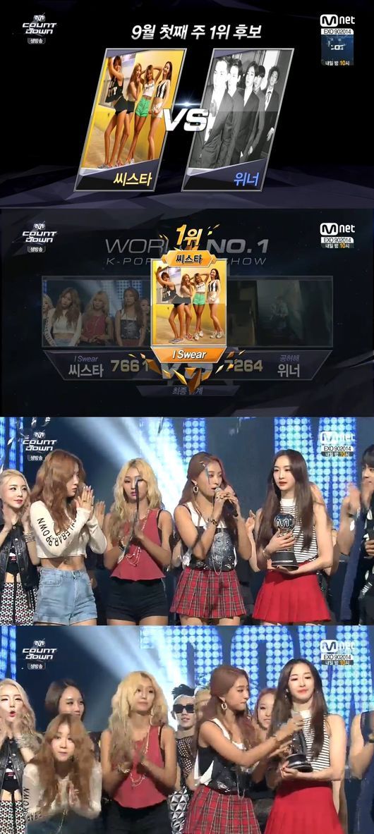 씨스타는 4일 오후 방송된 엠넷 가요프로그램 ‘엠카운트다운’에서 ‘아이 스웨어(I Swear)’로 위너의 ‘공허해’를 제치고 1위 트로피를 거머쥐었다.