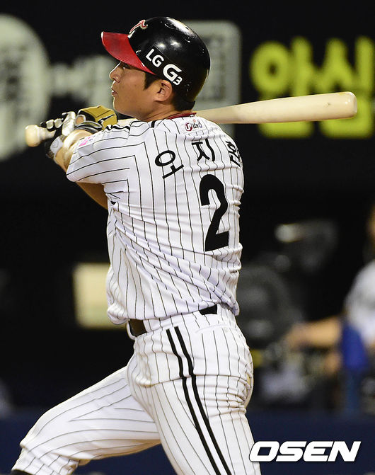 4회말 LG 공격 선두타자로 나선 오지환이 선제 우월 솔로포를 날리고 타구를 바라보고 있다.