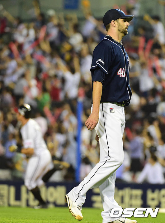 4회말 LG 공격 선두타자로 나선 오지환에게 선제 우월 솔로포를 허용한 두산 선발 니퍼트가 아쉬워하고 있다.