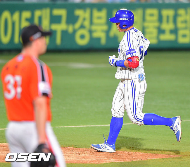 4일 오후 대구구장에서 열린 2014 한국야쿠르트 세븐 프로야구 삼성 라이온스와 한화 이글스의 경기, 5회말 2사 삼성 조동찬이 솔로홈런을 날리고 베이스를 돌고 있다.