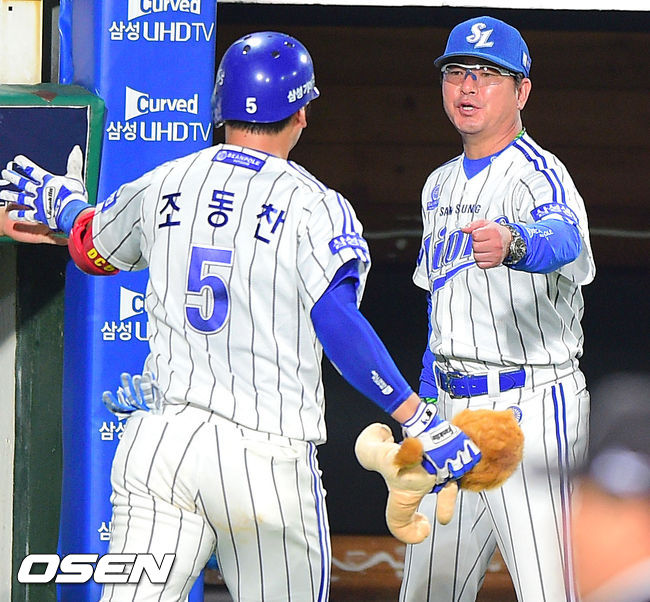 4일 오후 대구구장에서 열린 2014 한국야쿠르트 세븐 프로야구 삼성 라이온스와 한화 이글스의 경기, 5회말 2사 삼성 조동찬이 솔로홈런을 날리고 류중일 감독의 축하를 받고 있다.