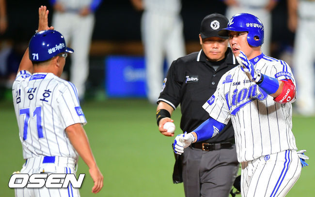 4일 오후 대구구장에서 열린 2014 한국야쿠르트 세븐 프로야구 삼성 라이온스와 한화 이글스의 경기, 5회말 2사 삼성 조동찬이 솔로홈런을 날리고 김평호 코치와 하이파이브를 하고 있다.