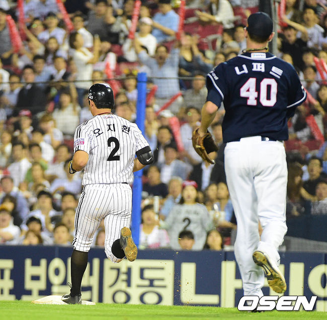 5회말 LG 공격 1사 주자없는 상황 오지환이 기습 내야안타를 날리고 1루에서 세이프되고 있다.