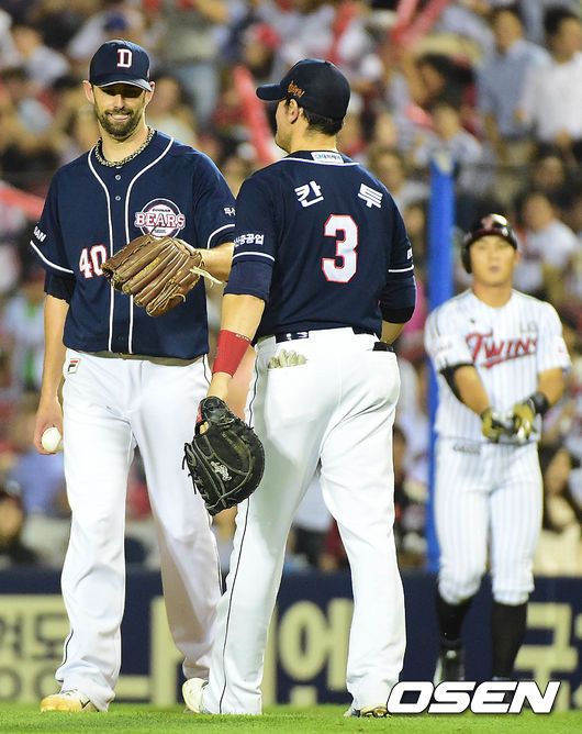 5회말 LG 공격 1사 주자없는 상황 오지환이 기습 내야안타를 날리고 1루에서 세이프됐다. 아쉬워하며 대화를 나누는 두산 선발 니퍼트와 칸투.