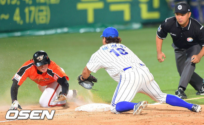 4일 오후 대구구장에서 열린 2014 한국야쿠르트 세븐 프로야구 삼성 라이온스와 한화 이글스의 경기, 7회초 2사 1루 한화 피에의 안타때 1루 주자 송광민이 3루수 박석민에게 태그아웃되고 있다. 한화에서 비디오판독 요청했지만 결과는 아웃판정.