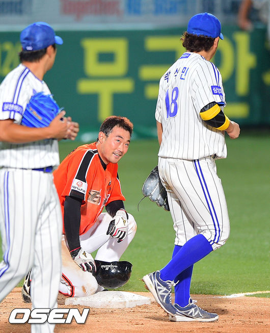 4일 오후 대구구장에서 열린 2014 한국야쿠르트 세븐 프로야구 삼성 라이온스와 한화 이글스의 경기, 7회초 2사 1루 한화 피에의 안타때 1루 주자 송광민이 3루수 박석민에게 태그아웃됐다. 비디오 판독을 요청한 송광민이 박석민을 바라보며 미소 짓고 있다. 한화에서 비디오판독 요청했지만 결과는 아웃판정.