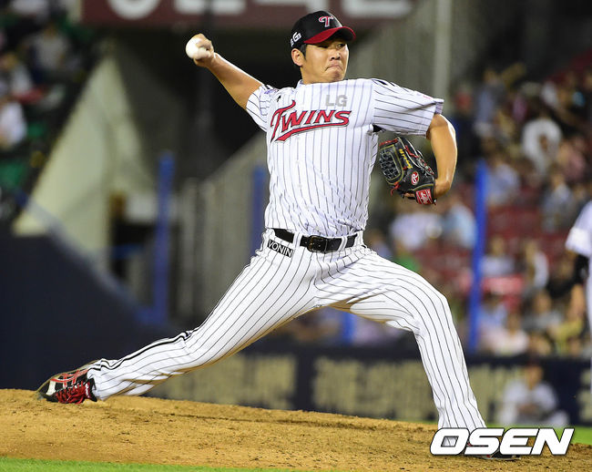 7회초 두산 공격 때 마운드에 오른 LG 투수 정찬헌이 힘차게 공을 뿌리고 있다.