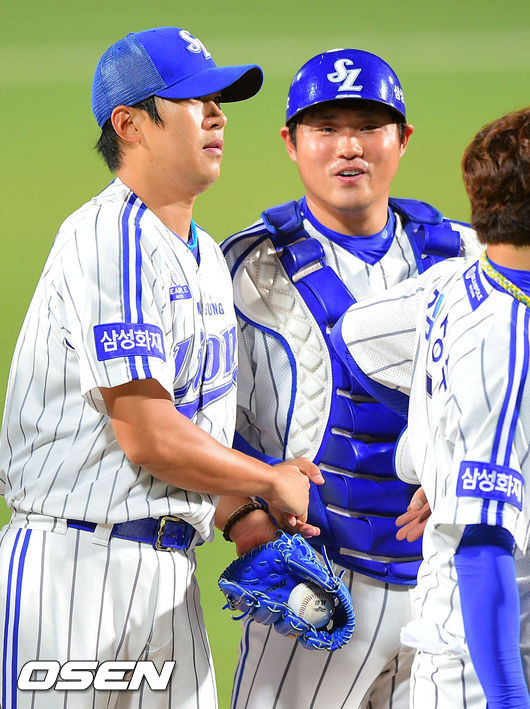 경기종료 후 삼성 완봉승 거둔 윤성환이 이지영 포수와 이야기를 나누고 있다. / soul1014@osen.co.kr