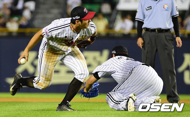 7회초 두산 공격 2사 만루 상황 양의지의 추격의 1타점 내야안타 때 LG 투수 이동현과 오지환이 넘어지며 타구를 잡고 있다. 하지만 송구 할 타이밍이 늦어지며 타자주자 1루 세이프.