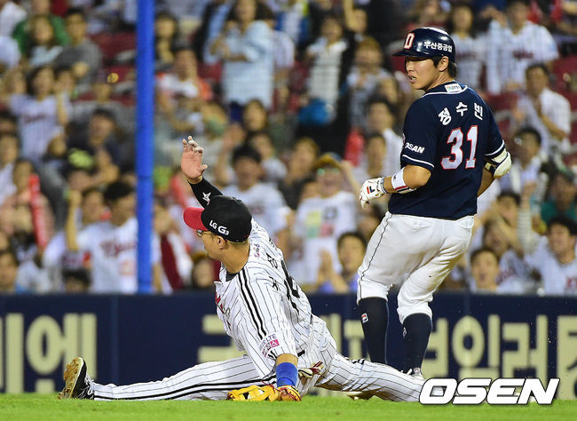 8회초 두산 공격 2사 주자없는 상황 정수빈의 내야 땅볼 타구 때 LG 1루수 정성훈이 유격수 오지환의 송구를 잡아내고 타자 주자를 아웃시키고 있다.