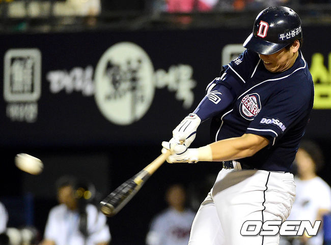 9회초 두산 공격 선두타자로 나선 김현수가 우월 동점 솔로포를 날리고 있다.