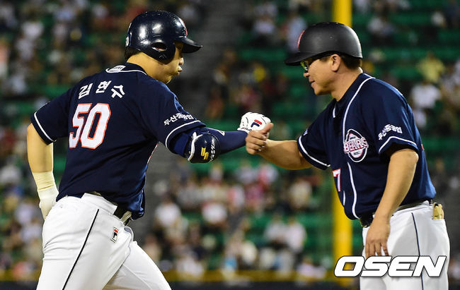 9회초 두산 공격 선두타자로 나선 김현수가 우월 동점 솔로포를 날리고 그라운드를 돌며 전형도 코치와 인사를 나누고 있다.