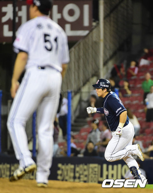 9회초 두산 공격 선두타자로 나선 김현수가 우월 동점 솔로포를 날리고 그라운드를 돌고 있다.