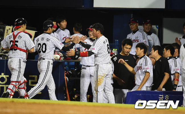 연장 11회초 두산 공격 무사 만루 상황을 무실점으로 막아낸 LG 투수 임정우와 포수 김재민이 더그아웃으로 들어오며 동료들과 인사를 나누고 있다.