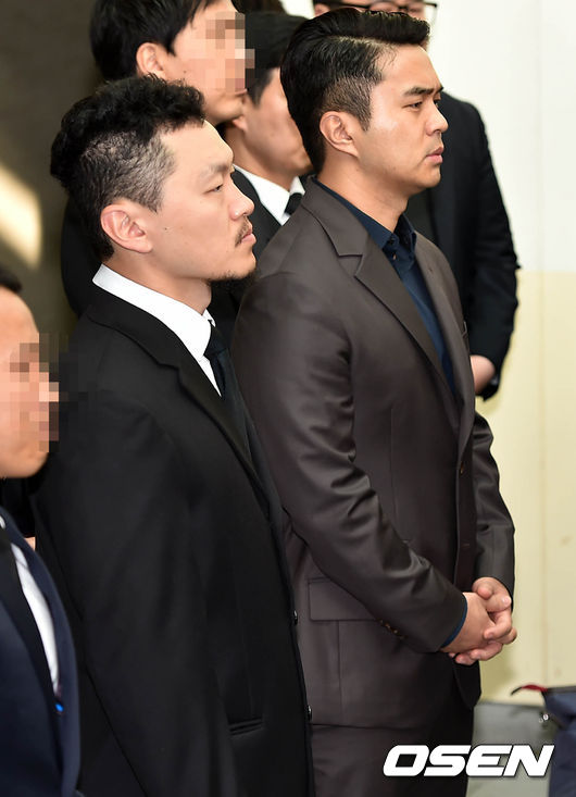 양동근과 정준이 발인식에 참석해 애도를 하고 있다.