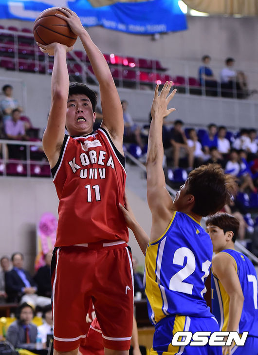 5일 오후 경기도 용인실내체육관에서 열린 '2014 KB국민은행 대학농구리그 챔피언결정전' 2차전 경기, 1쿼터 고려대 강상재가 점프슛을 시도하고 있다.