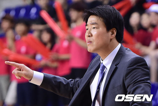 5일 오후 경기도 용인실내체육관에서 열린 '2014 KB국민은행 대학농구리그 챔피언결정전' 2차전 경기, 연세대 은희석 감독이 작전지시를 하고 있다.