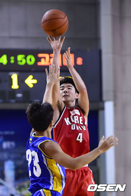 5일 오후 경기도 용인실내체육관에서 열린 '2014 KB국민은행 대학농구리그 챔피언결정전' 2차전 경기, 1쿼터 고려대 김낙현이 점프슛을 시도하고 있다.