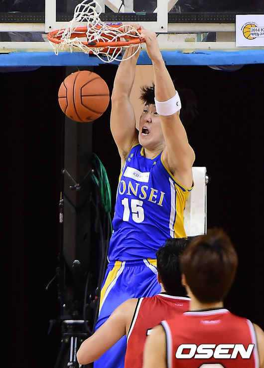 5일 오후 경기도 용인실내체육관에서 열린 '2014 KB국민은행 대학농구리그 챔피언결정전' 2차전 경기, 2쿼터 연세대 김준일이 덩크를 하고 있다.