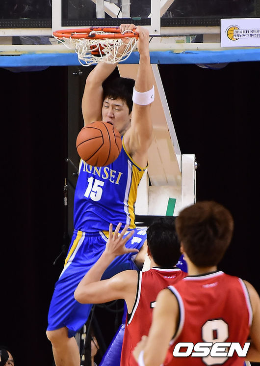 5일 오후 경기도 용인실내체육관에서 열린 '2014 KB국민은행 대학농구리그 챔피언결정전' 2차전 경기, 2쿼터 연세대 김준일이 덩크를 하고 있다.
