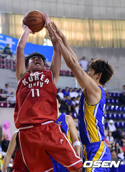 5일 오후 경기도 용인실내체육관에서 열린 '2014 KB국민은행 대학농구리그 챔피언결정전' 2차전 경기, 2쿼터 고려대 강상재가 골밑슛을 시도하고 있다.
