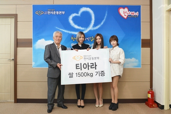 티아라는 5일 오후 서울 동두천 천사운동본부를 방문, 쌀 1500kg을 기부했다. 이날 티아라를 대표해 멤버 보람과 큐리, 효민이 천사운동본부를 찾았다.