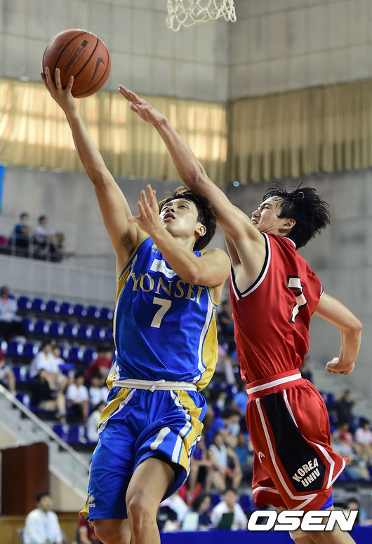 5일 오후 경기도 용인실내체육관에서 열린 '2014 KB국민은행 대학농구리그 챔피언결정전' 2차전 경기, 3쿼터 연세대 김기윤이 레이업슛을 시도하고 있다.