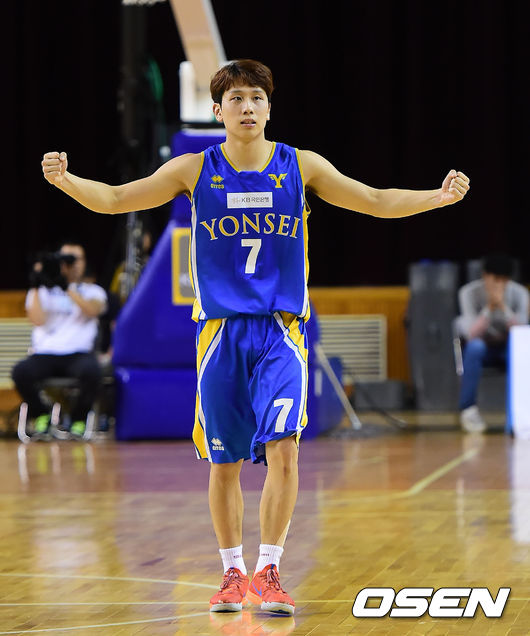 5일 오후 경기도 용인실내체육관에서 열린 '2014 KB국민은행 대학농구리그 챔피언결정전' 2차전 경기, 3쿼터 연세대 김기윤이 기뻐하고 있다.