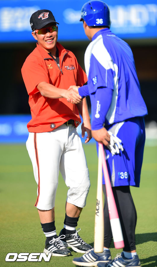 5일 오후 대구구장에서 열린 '2014 한국야쿠르트 세븐 프로야구' 삼성 라이온스와 한화 이글스의 경기에 앞서 삼성 이승엽과 한화 정근우가 이야기를 나누고 있다.