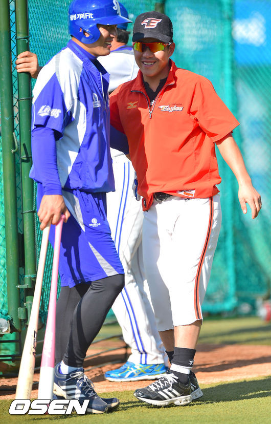 5일 오후 대구구장에서 열리는 '2014 한국야쿠르트 세븐 프로야구' 삼성 라이온스와 한화 이글스의 경기에 앞서 삼성 이승엽과 한화 정근우가 이야기를 나누고 있다.