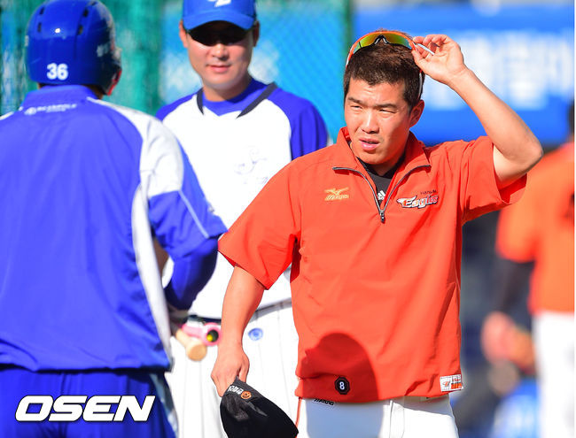 5일 오후 대구구장에서 열리는 '2014 한국야쿠르트 세븐 프로야구' 삼성 라이온스와 한화 이글스의 경기에 앞서 삼성 이승엽과 한화 정근우가 이야기를 나누고 있다.