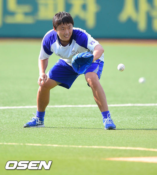 5일 오후 대구구장에서 열리는 '2014 한국야쿠르트 세븐 프로야구' 삼성 라이온스와 한화 이글스의 경기에 앞서 삼성 배영수가 타구를 잡아내고 있다.