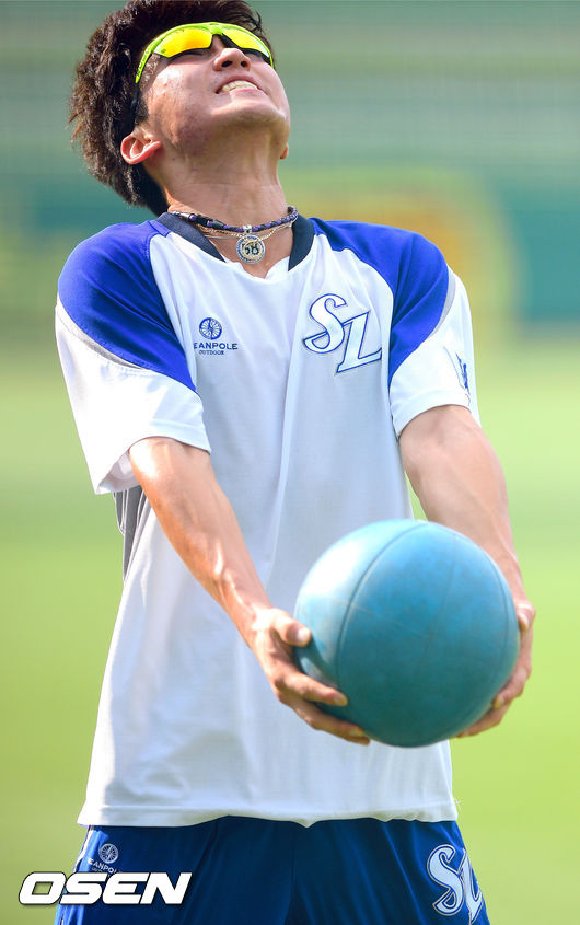 5일 오후 대구구장에서 열리는 '2014 한국야쿠르트 세븐 프로야구' 삼성 라이온스와 한화 이글스의 경기에 앞서 삼성 박해민이 짐볼로 근력강화훈려을 하고 있다.