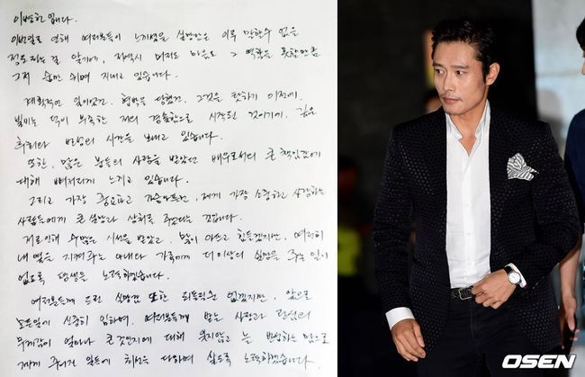 이병헌은 5일 소속사 BH엔터테인먼트 페이스북을 통해 장문의 자필 편지를 올렸다. 그가 손수 공들여 쓴 편지의 사진이 함께 게재됐다.