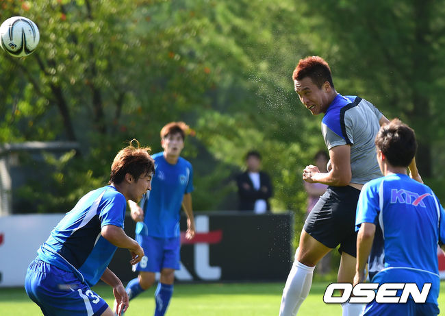 5일 오후 파주 트레이닝센터(NFC)에서 열린 아시안게임 축구 대표팀과 대전 코레일의 연습경기, 김신욱이 헤딩을 시도하고 있다.