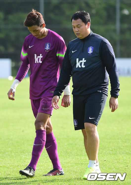 5일 오후 파주 트레이닝센터(NFC)에서 열린 아시안게임 축구 대표팀과 대전 코레일의 연습경기, 김승규가 이운재 코치와 그라운드를 걷고 있다.