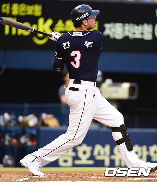 1회초 두산 공격 1사 1, 2루 상황 칸투가 좌익수 키를 넘기는 선제 2타점 적시 2루타를 날리고 있다.
