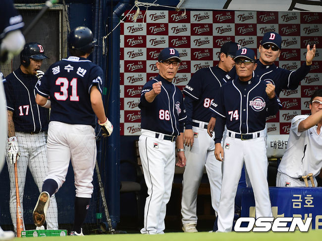 1회초 두산 공격 1사 1, 2루 상황 칸투의 좌익수 키를 넘기는 선제 2타점 적시 2루타를 때 홈을 밟은 정수빈, 민병헌과 송일수 감독을 비롯한 코칭스태프가 인사를 나누고 있다.