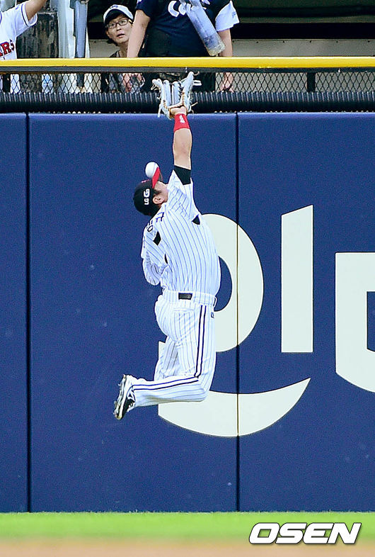 1회초 두산 공격 1사 1, 2루 상황 칸투의 좌익수 키를 넘기는 선제 2타점 적시 2루타 때 LG 좌익수 이병규가 점프 캐치를 시도했지만 아쉽게 놓치고 있다.
