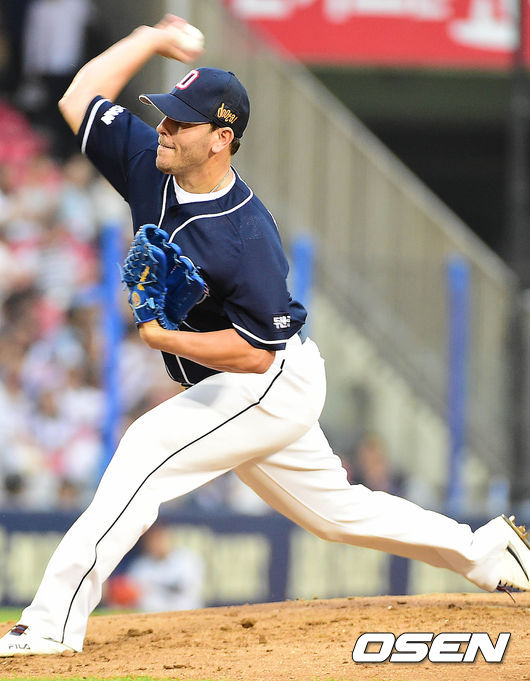 두산 선발 마야가 힘차게 공을 뿌리고 있다.