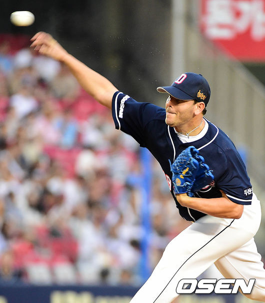 두산 선발 마야가 힘차게 공을 뿌리고 있다.